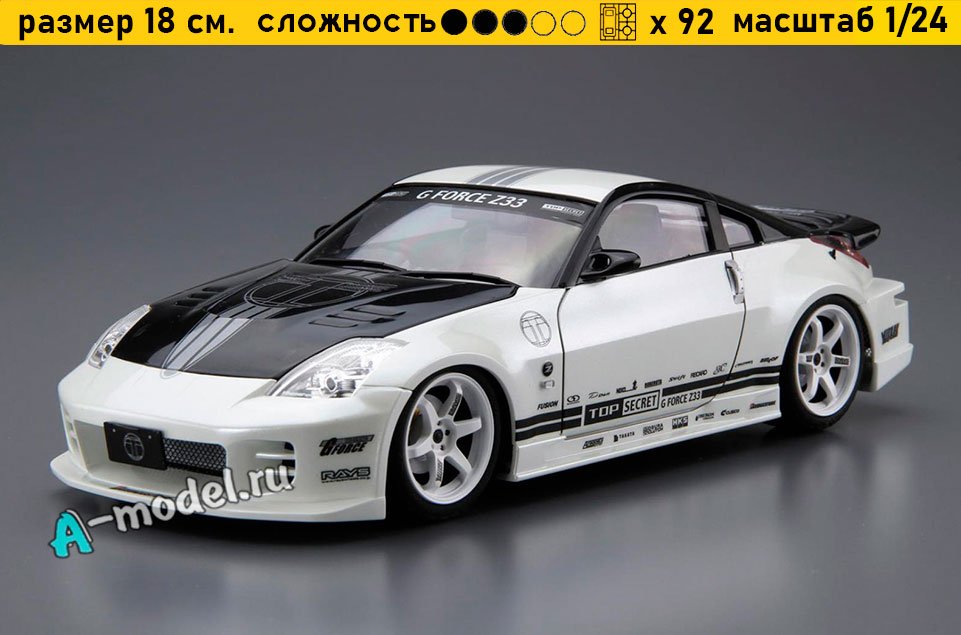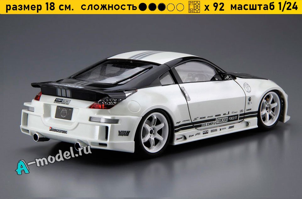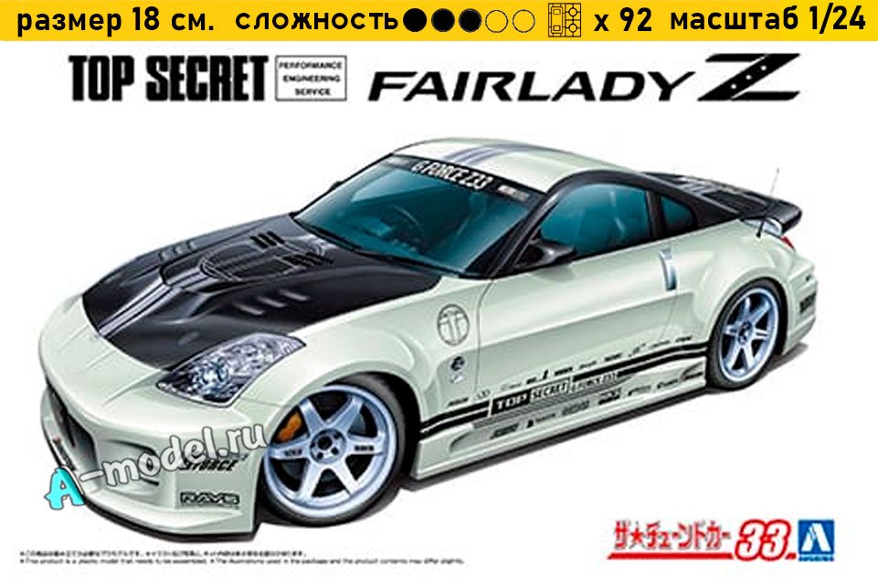 Сборная пластиковая модель автомобиля NINISSAN Fairlady Z TOP SECRET в масштабе 1/24 от компании AOSHIMA. В комплекте набора с моделью: пластиковые детали, инструкция, декали, окрасочные маски. Отличное схождение деталей модели и прекрасное их качество помогут получить вам удовольствие и массу положительных эмоций во время сборки. Прекрасным дополнением являются декали идущие в комплекте. Понятная инструкция с крупными рисунками облегчит в понимании моментов сборки. Мы давно сотрудничаем с этим производителем, позиция с товаром оригинальна и всегда готова для покупки. У нас всегда в наличии весь ассортимент продукции. В интернет-магазине представлен ассортимент от множества других компаний связанных с моделизмом. Акции и скидки которые часто проводятся у нас позволят вам приобрести товары нашего магазина по привлекательной цене. Вы всегда можете быстро оформить заказ. Предусмотрены несколько видов оплаты банковскими картами. Ваши заказы отправляем в любую точку России после оплаты, при доставке мы выберем минимальный по цене
