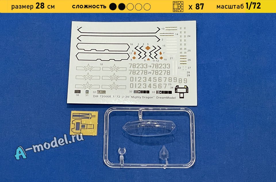 Сборная пластиковая модель истребителя истребителя J-20 Mighty Dragon в масштабе 1/72 от компании Dream model. В комплекте набора с моделью: пластиковые детали, инструкция, декали. Отличное схождение деталей модели и прекрасное их качество помогут получить вам удовольствие и массу положительных эмоций во время сборки. Прекрасным дополнением являются декали идущие в комплекте. Понятная инструкция с крупными рисунками облегчит в понимании моментов сборки. Мы давно сотрудничаем с этим производителем, позиция с товаром оригинальна и всегда готова для покупки. У нас всегда в наличии весь ассортимент продукции. В интернет-магазине представлен ассортимент от множества других компаний связанных с моделизмом. Акции и скидки которые часто проводятся у нас позволят вам приобрести товары нашего магазина по привлекательной цене. Вы всегда можете быстро оформить заказ. Предусмотрены несколько видов оплаты банковскими картами. Ваши заказы отправляем в любую точку России после оплаты, при доставке мы выберем минимальный по цене тариф. Внимание модель не комплектуется клеем и красками, их вы можете отдельно приобрести у нас на сайте.