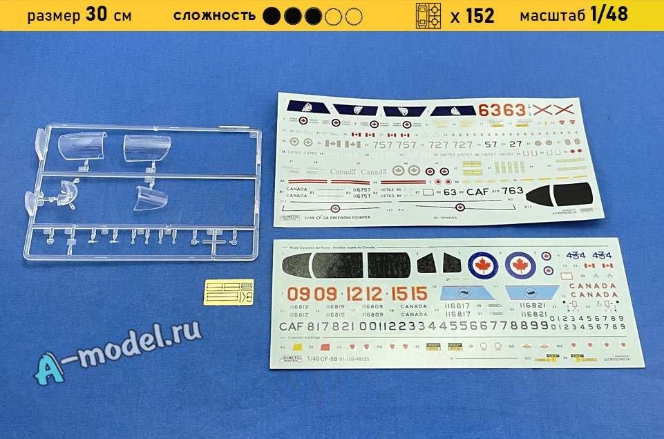 Сборная пластиковая модель самолета истребителя CF-5D Freedom в масштабе 1/48 от компании Kinetic model kits. В комплекте набора с моделью: пластиковые детали, инструкция, декали, фототравление, резиновые шины. Отличное схождение деталей модели и прекрасное их качество помогут получить вам удовольствие и массу положительных эмоций во время сборки. Прекрасным дополнением являются декали идущие в комплекте. Понятная инструкция с крупными рисунками облегчит в понимании моментов сборки. Мы давно сотрудничаем с этим производителем, позиция с товаром оригинальна и всегда готова для покупки. У нас всегда в наличии весь ассортимент продукции. В интернет-магазине представлен ассортимент от множества других компаний связанных с моделизмом. Акции и скидки которые часто проводятся у нас позволят вам приобрести товары нашего магазина по привлекательной цене. Вы всегда можете быстро оформить заказ. Предусмотрены несколько видов оплаты банковскими картами. Ваши заказы отправляем в любую точку России после оплаты, при доставке мы выберем минимальный по цене тариф.