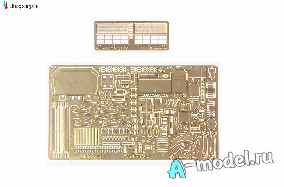 Набор фототравление от производителя Микродизайн для сборных моделей САУ ИСУ-152 в масштабе 1/35 которые выпускают фирмы Звезда и Tamiya. Набор комплектуется 2 пластинами фототравления и в цветных картинках понятной инструкции. Некоторые элементы вашей модели после применения фототравления можно сделать подвижными к примеру открывающиеся люки, кокпиты фонарей или капоты моторных отделений на автомобилях или самолетах. Количество уникальных деталей 70 штуки, уровень сложности - средний. Любой большой или малый набор фототравление придаст вашей модели более респектабельный и законченный вид.