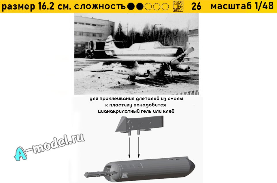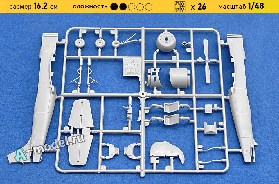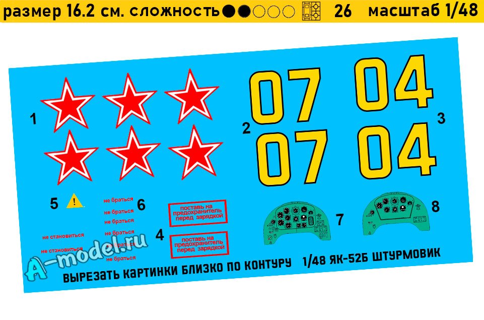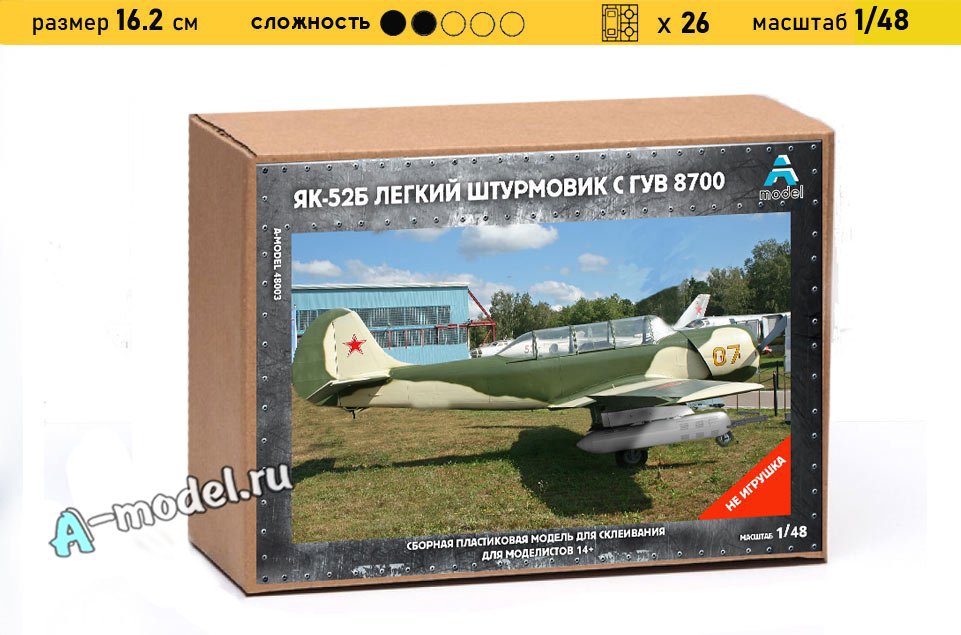 Сборная пластиковая модель легкого штурмовика Як-52Б с ГУВ 8700 в масштабе 1/48 от компании A-model. В комплекте набора с моделью: пластиковые детали, инструкция, декали. Отличное схождение деталей модели и прекрасное их качество помогут получить вам удовольствие и массу положительных эмоций во время сборки. Прекрасным дополнением являются декали идущие в комплекте. Понятная инструкция с крупными рисунками облегчит в понимании моментов сборки. Мы давно сотрудничаем с этим производителем, позиция с товаром оригинальна и всегда готова для покупки. У нас всегда в наличии весь ассортимент продукции. В интернет-магазине представлен ассортимент от множества других компаний связанных с моделизмом. Акции и скидки которые часто проводятся у нас позволят вам приобрести товары нашего магазина по привлекательной цене. Вы всегда можете быстро оформить заказ. Предусмотрены несколько видов оплаты банковскими картами. Ваши заказы отправляем в любую точку России после оплаты, при доставке мы выберем минимальный по цене тариф. Внимание модель не комплектуется клеем и красками, их вы можете отдельно приобрести у нас на сайте.