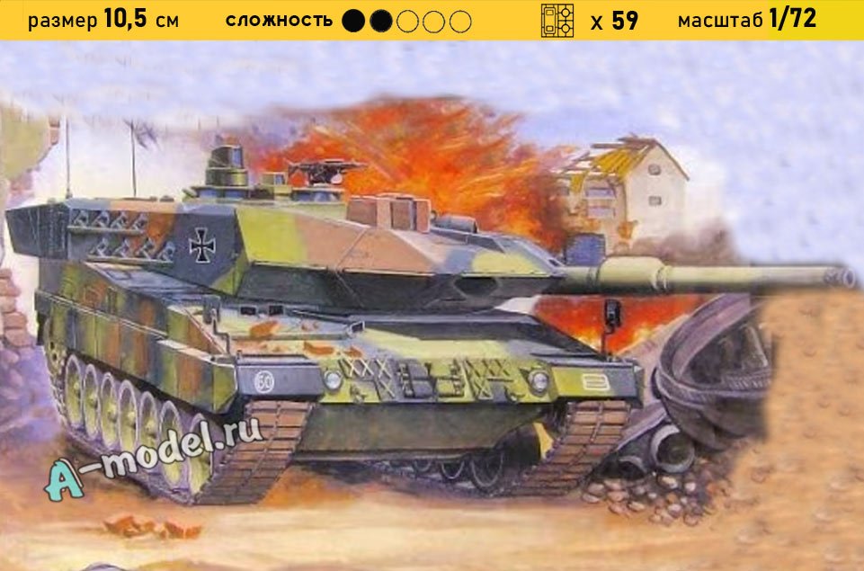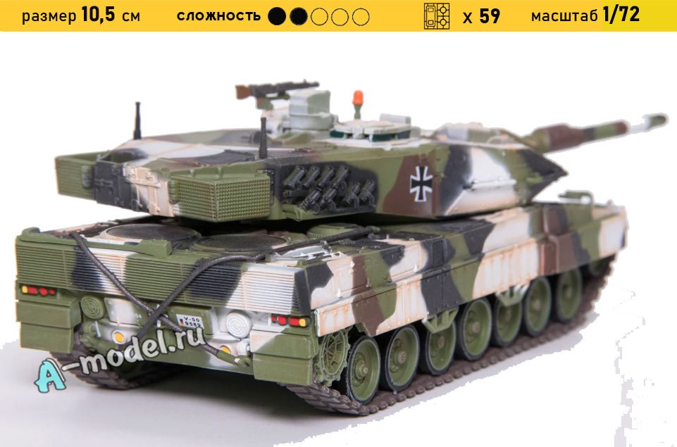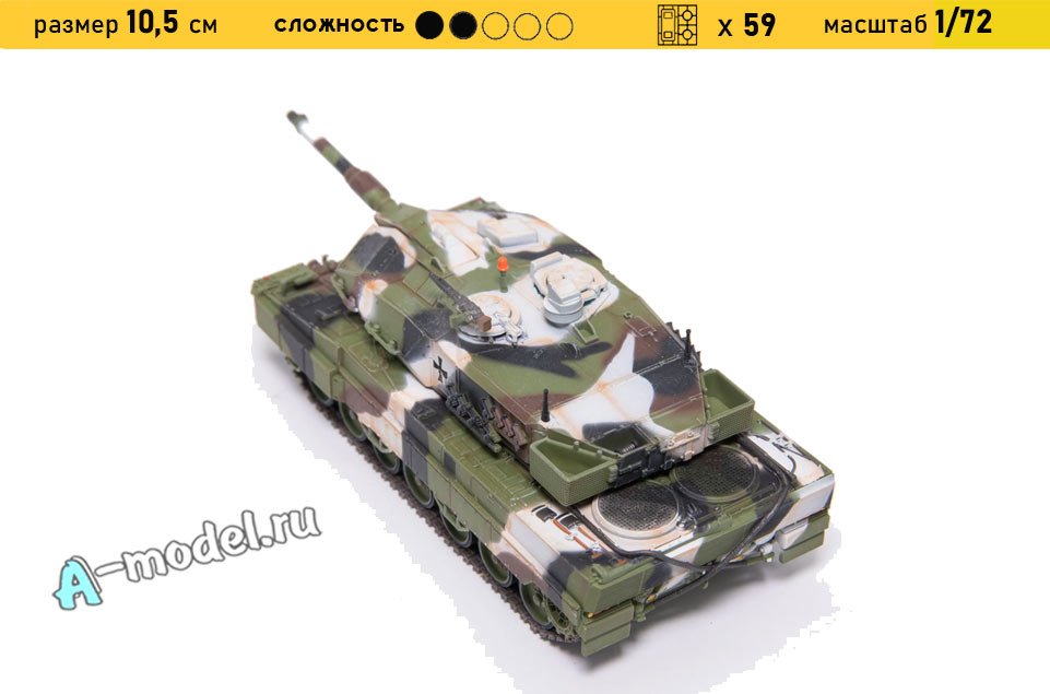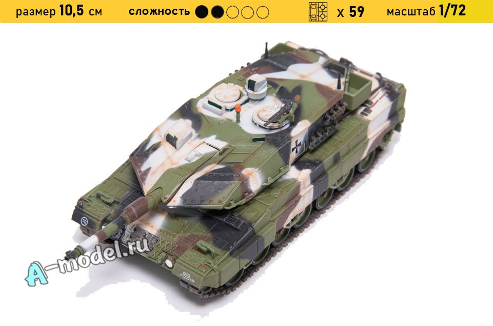 Сборная пластиковая модель танка Леопард 2А5 в масштабе 1/72 от компании A-model. В комплекте набора с моделью: пластиковые детали, инструкция. Отличное схождение деталей модели и прекрасное их качество помогут получить вам удовольствие и массу положительных эмоций во время сборки. Прекрасным дополнением являются декали идущие в комплекте. Понятная инструкция с крупными рисунками облегчит в понимании моментов сборки. Мы давно сотрудничаем с этим производителем, позиция с товаром оригинальна и всегда готова для покупки. У нас всегда в наличии весь ассортимент продукции. В интернет-магазине представлен ассортимент от множества других компаний связанных с моделизмом. Акции и скидки которые часто проводятся у нас позволят вам приобрести товары нашего магазина по привлекательной цене. Вы всегда можете быстро оформить заказ. Предусмотрены несколько видов оплаты банковскими картами. Ваши заказы отправляем в любую точку России после оплаты, при доставке мы выберем минимальный по цене тариф. Внимание модель не комплектуется клеем и красками, их вы можете отдельно приобрести у нас на сайте.