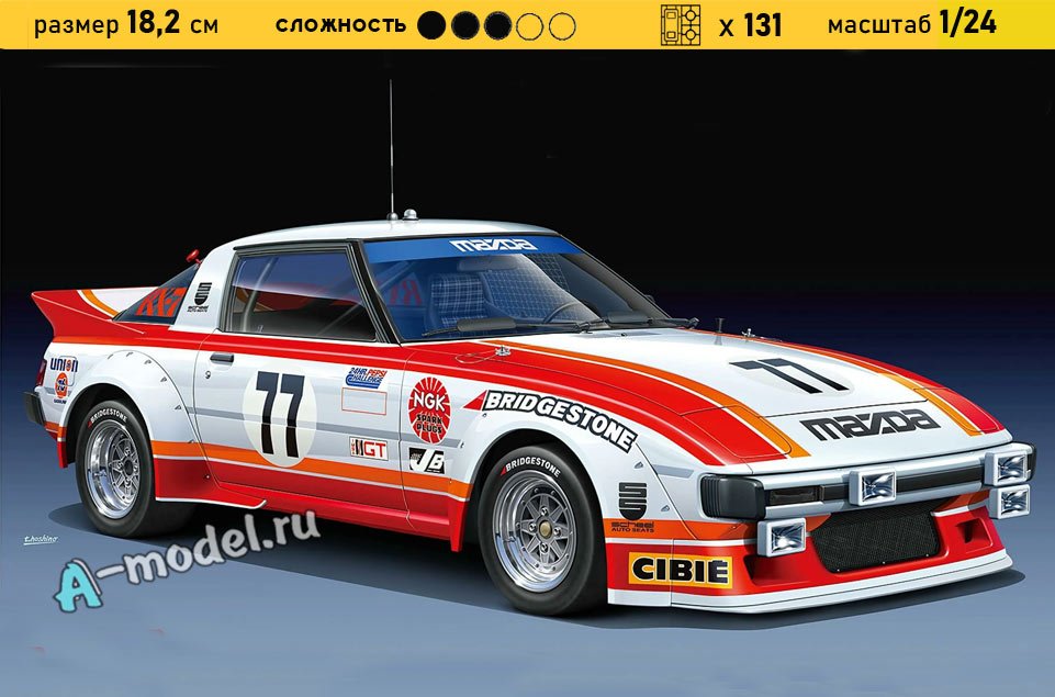 Сборная пластиковая модель автомобиля MAZDA Savanna RX-7 DAYTONA CAR 1979 в масштабе 1/24 от компании Hasegawa. В комплекте набора с моделью: пластиковые детали, инструкция, декали. Отличное схождение деталей модели и прекрасное их качество помогут получить вам удовольствие и массу положительных эмоций во время сборки. Прекрасным дополнением являются декали идущие в комплекте. Понятная инструкция с крупными рисунками облегчит в понимании моментов сборки. Мы давно сотрудничаем с этим производителем, позиция с товаром оригинальна и всегда готова для покупки. У нас всегда в наличии весь ассортимент продукции. В интернет-магазине представлен ассортимент от множества других компаний связанных с моделизмом. Акции и скидки которые часто проводятся у нас позволят вам приобрести товары нашего магазина по привлекательной цене. Вы всегда можете быстро оформить заказ. Предусмотрены несколько видов оплаты банковскими картами. Ваши заказы отправляем в любую точку России после оплаты, при доставке мы выберем минимальный по цене тариф. Внимание модель не комплектуется клеем и красками, их вы можете отдельно приобрести у нас на сайте.