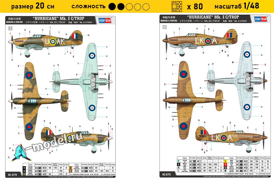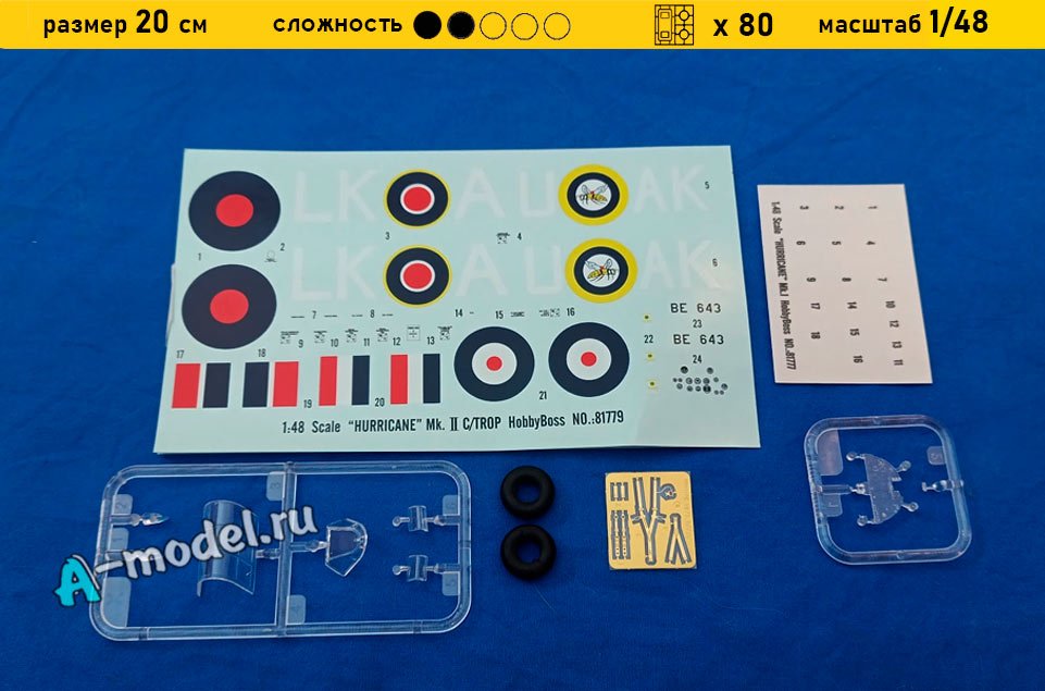 Сборная пластиковая модель истребителя Hurricane Mk IIC trop в масштабе 1/48 от компании Hobby Boss. В комплекте набора с моделью: пластиковые детали, инструкция, декали, фототравление, окрасочные маски, резиновые шины. Отличное схождение деталей модели и прекрасное их качество помогут получить вам удовольствие и массу положительных эмоций во время сборки. Прекрасным дополнением являются декали идущие в комплекте. Понятная инструкция с крупными рисунками облегчит в понимании моментов сборки. Мы давно сотрудничаем с этим производителем, позиция с товаром оригинальна и всегда готова для покупки. У нас всегда в наличии весь ассортимент продукции. В интернет-магазине представлен ассортимент от множества других компаний связанных с моделизмом. Акции и скидки которые часто проводятся у нас позволят вам приобрести товары нашего магазина по привлекательной цене. Вы всегда можете быстро оформить заказ. Предусмотрены несколько видов оплаты банковскими картами. Ваши заказы отправляем в любую точку России после оплаты, при доставке мы выберем минимальный по цене
