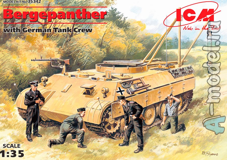 Немецкий бронированный танк 2-ой мировой войны, использовавшийся для эвакуации тяжелой техники, например таких, как модели танков «Тигр 2» или «Пантера». «Бергепантера» - так звали бронированную ремонтно-эвакуационную машину (БРЭМ) „Пантера“. Что же говорят про нее специалисты – «надежная и очень ценная машина», «лучшая, пожалуй самая лучшая»…и не спроста. «Бергепантера» после испытаний зарекомендовала себя так: проходимость хорошая, броня надежная, трос длинный, лебедка компактна и ею можно управлять из-под брони. А это значит, что эта машина под минометным огнем противника эвакуирует аварийный средний или тяжелый танк не просто с поля боя, а вытащит из любого рва, реки, болота. В последствии, как оказалось, проявились и недостатки: во-первых, было мало специалистов для управления такой техникой, вследствие чего бортовые передачи постоянно ломались, а запасные части для ремонта заполняли все свободное место в машине; во-вторых, перегрузка моторно-трансмиссионной группы; в-третьих, пожары – горели двигатели, карбюраторы … однако БРЭМ использовался до конца войны. Единственный танк, который можно было сравнить с «Бергепантерой» стал БРЭМ Т-12, который разработали в США. Купить эту модель вы можете на нашем сайте или сделать заказ по телефону. Отправка посылки осуществляется в день поступления оплаты заказа. Так же есть услуга самовывоз. В нашем интернет-магазине А-Модель вы можете найти модели танков от ACADEMY.