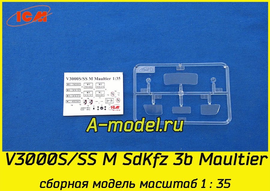 Сборная пластиковая модель грузового автомобиля V3000S/SS M SdKfz 3b maultier в масштабе 1/35 от компании ICM. В комплекте набора с моделью: пластиковые детали, инструкция, декали. Отличное схождение деталей модели и прекрасное их качество помогут получить вам удовольствие и массу положительных эмоций во время сборки. Прекрасным дополнением являются декали идущие в комплекте. Понятная инструкция с крупными рисунками облегчит в понимании моментов сборки. Мы давно сотрудничаем с этим производителем, позиция с товаром оригинальна и всегда готова для покупки. У нас всегда в наличии весь ассортимент продукции. В интернет-магазине представлен ассортимент от множества других компаний связанных с моделизмом. Акции и скидки которые часто проводятся у нас позволят вам приобрести товары нашего магазина по привлекательной цене. Вы всегда можете быстро оформить заказ. Предусмотрены несколько видов оплаты банковскими картами. Ваши заказы отправляем в любую точку России после оплаты, при доставке мы выберем минимальный по цене тариф.