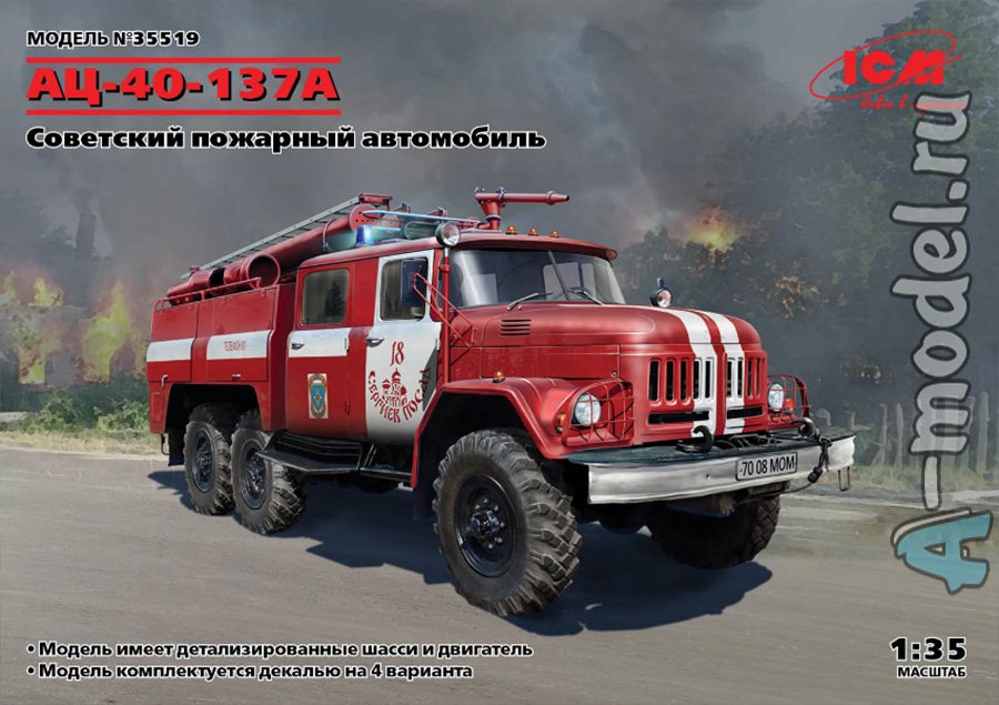 Сборная пластиковая модель пожарной машины АЦ-40-137А в масштабе 1/35 от компании ICM. В комплекте набора с моделью: пластиковые детали, инструкция, декали, резиновые шины. Отличное схождение деталей модели и прекрасное их качество помогут получить вам удовольствие и массу положительных эмоций во время сборки. Прекрасным дополнением являются декали идущие в комплекте. Понятная инструкция с крупными рисунками облегчит в понимании моментов сборки. Мы давно сотрудничаем с этим производителем, позиция с товаром оригинальна и всегда готова для покупки. У нас всегда в наличии весь ассортимент продукции. В интернет-магазине представлен ассортимент от множества других компаний связанных с моделизмом. Акции и скидки которые часто проводятся у нас позволят вам приобрести товары нашего магазина по привлекательной цене. Вы всегда можете быстро оформить заказ. Предусмотрены несколько видов оплаты банковскими картами. Ваши заказы отправляем в любую точку России после оплаты, при доставке мы выберем минимальный по цене тариф.