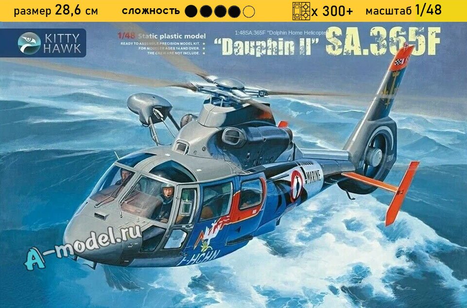 Сборная пластиковая модель вертолета Dauphin II Sa.365N в масштабе 1/48 от компании Kitty Hawk. В комплекте набора с моделью: пластиковые детали, инструкция, декали. Отличное схождение деталей модели и прекрасное их качество помогут получить вам удовольствие и массу положительных эмоций во время сборки. Прекрасным дополнением являются декали идущие в комплекте. Понятная инструкция с крупными рисунками облегчит в понимании моментов сборки. Мы давно сотрудничаем с этим производителем, позиция с товаром оригинальна и всегда готова для покупки. У нас всегда в наличии весь ассортимент продукции. В интернет-магазине представлен ассортимент от множества других компаний связанных с моделизмом. Акции и скидки которые часто проводятся у нас позволят вам приобрести товары нашего магазина по привлекательной цене. Вы всегда можете быстро оформить заказ. Предусмотрены несколько видов оплаты банковскими картами. Ваши заказы отправляем в любую точку России после оплаты, при доставке мы выберем минимальный по цене тариф. Внимание модель не комплектуется клеем и красками, их вы можете отдельно приобрести у нас на сайте.