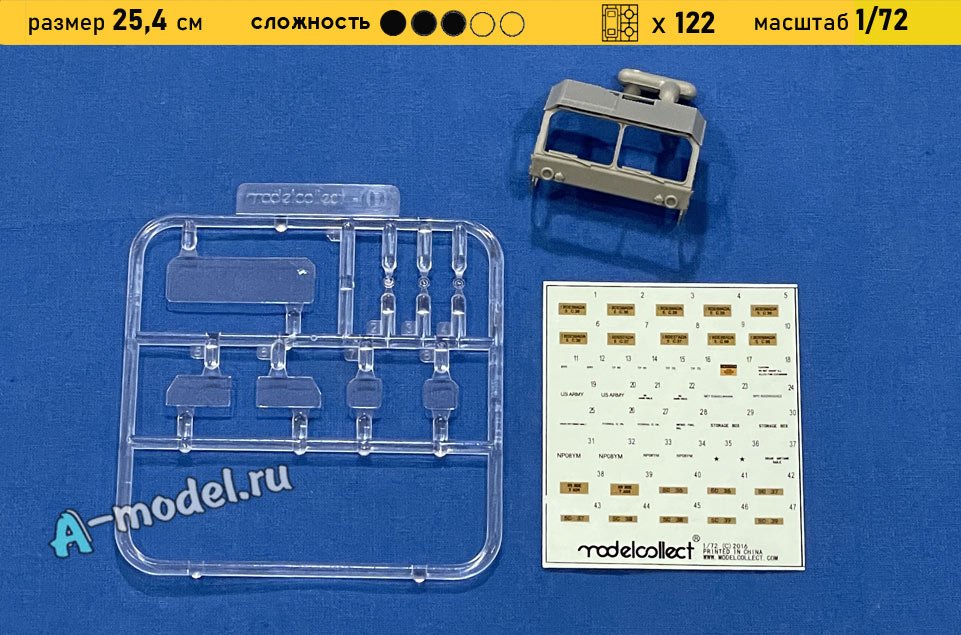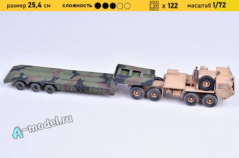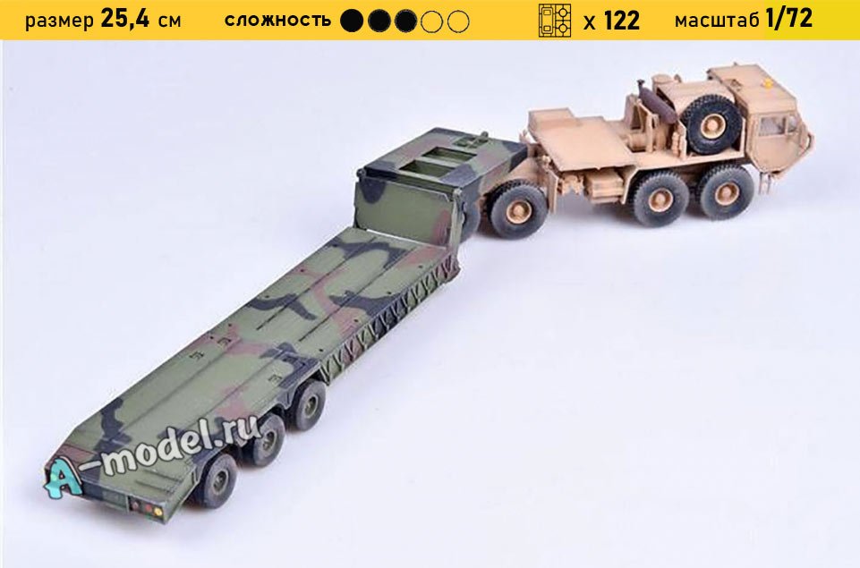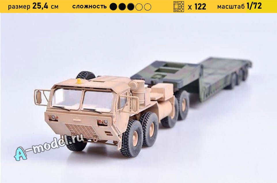 Сборная пластиковая модель тягача M983A2 Hemtt и полуприцепа M870A1 в масштабе 1/72 от компании Modelcollect. В комплекте набора с моделью: пластиковые детали, инструкция, декали. Отличное схождение деталей модели и прекрасное их качество помогут получить вам удовольствие и массу положительных эмоций во время сборки. Прекрасным дополнением являются декали идущие в комплекте. Понятная инструкция с крупными рисунками облегчит в понимании моментов сборки. Мы давно сотрудничаем с этим производителем, позиция с товаром оригинальна и всегда готова для покупки. У нас всегда в наличии весь ассортимент продукции. В интернет-магазине представлен ассортимент от множества других компаний связанных с моделизмом. Акции и скидки которые часто проводятся у нас позволят вам приобрести товары нашего магазина по привлекательной цене. Вы всегда можете быстро оформить заказ. Предусмотрены несколько видов оплаты банковскими картами. Ваши заказы отправляем в любую точку России после оплаты, при доставке мы выберем минимальный по цене тариф. Внимание модель не комплектуется клеем и красками, их вы можете отдельно приобрести у нас на сайте.