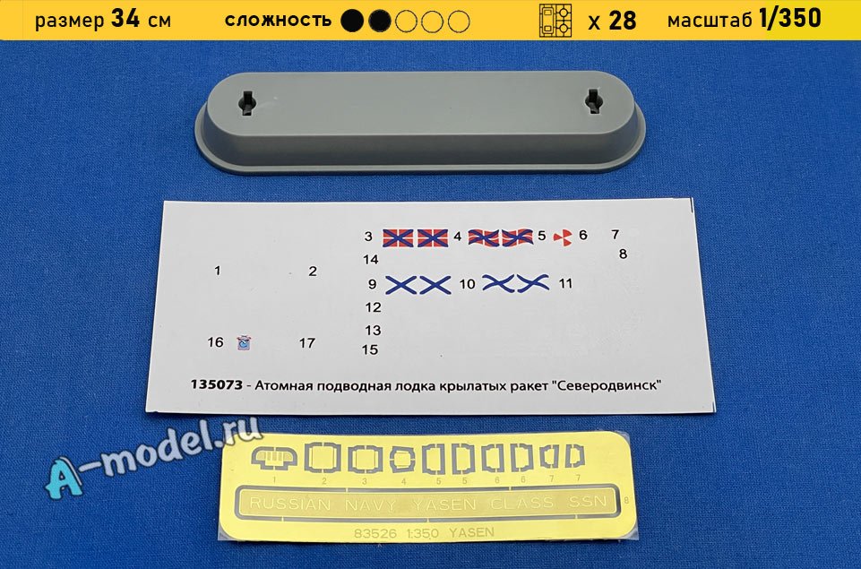 Сборная пластиковая модель атомной подводной лодки Северодвинск в масштабе 1/350 от компании Моделист. В комплекте набора с моделью: пластиковые детали, инструкция, декали, фототравление. Отличное схождение деталей модели и прекрасное их качество помогут получить вам удовольствие и массу положительных эмоций во время сборки. Прекрасным дополнением являются декали идущие в комплекте. Понятная инструкция с крупными рисунками облегчит в понимании моментов сборки. Мы давно сотрудничаем с этим производителем, позиция с товаром оригинальна и всегда готова для покупки. У нас всегда в наличии весь ассортимент продукции. В интернет-магазине представлен ассортимент от множества других компаний связанных с моделизмом. Акции и скидки которые часто проводятся у нас позволят вам приобрести товары нашего магазина по привлекательной цене. Вы всегда можете быстро оформить заказ. Предусмотрены несколько видов оплаты банковскими картами. Ваши заказы отправляем в любую точку России после оплаты, при доставке мы выберем минимальный по цене тариф. Внимание модель не комплектуется клеем и красками, их вы можете отдельно приобрести у нас на сайте.