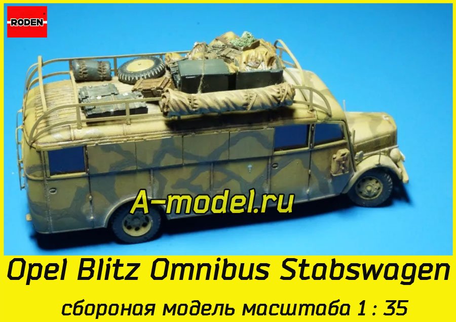 Прямо на этой странице Вы сможете найти и купить сборную модель военного автобуса Opel Blitz omnibus stabswagen 1/35 от Roden по доступной цене. Мы давно работаем с производителем Роден, поэтому позиция с артикулом 810 оригинальна и всегда готова для заказа. Несколько видов оплаты банковскими картами и доставка в любую точку России курьером или почтой.