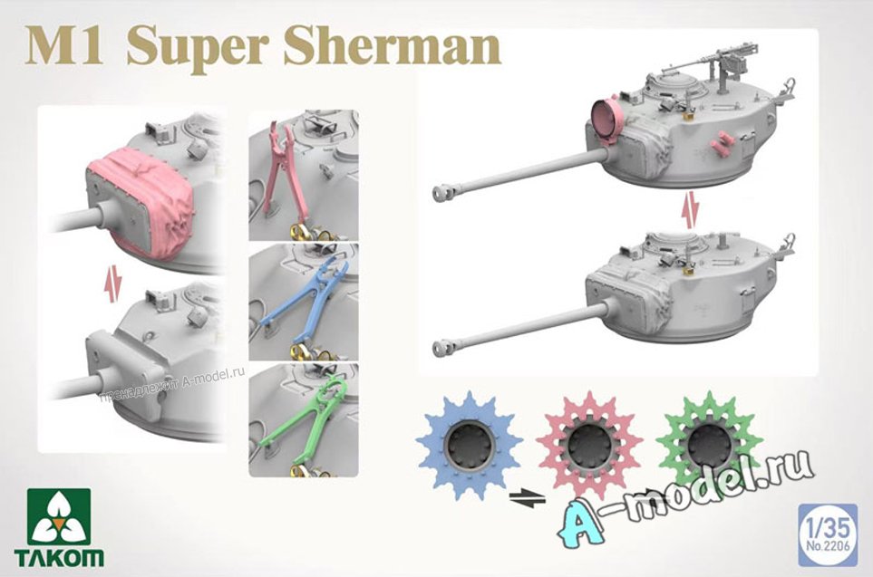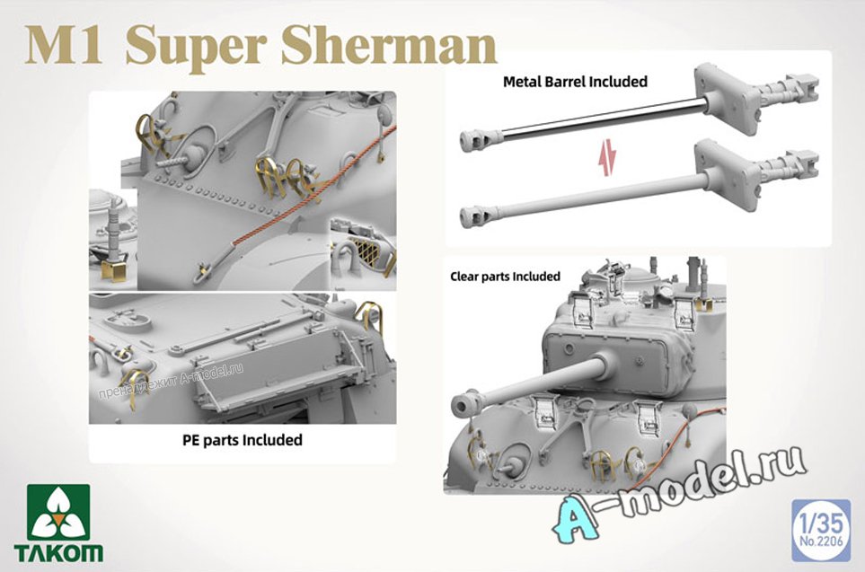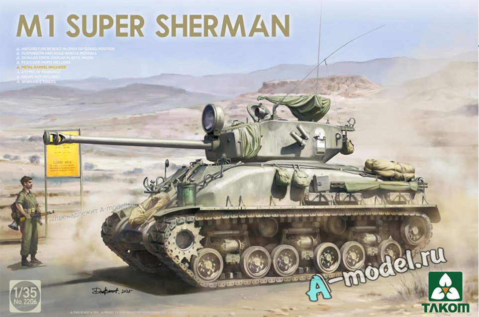 Сборная пластиковая модель танка M1 Super Sherman в масштабе 1/35 от компании TAKOM. В комплекте набора с моделью: пластиковые детали, инструкция, декали, фототравление. Отличное схождение деталей модели и прекрасное их качество помогут получить вам удовольствие и массу положительных эмоций во время сборки. Прекрасным дополнением являются декали идущие в комплекте. Понятная инструкция с крупными рисунками облегчит в понимании моментов сборки. Мы давно сотрудничаем с этим производителем, позиция с товаром оригинальна и всегда готова для покупки. У нас всегда в наличии весь ассортимент продукции. В интернет-магазине представлен ассортимент от множества других компаний связанных с моделизмом. Акции и скидки которые часто проводятся у нас позволят вам приобрести товары нашего магазина по привлекательной цене. Вы всегда можете быстро оформить заказ. Предусмотрены несколько видов оплаты банковскими картами. Ваши заказы отправляем в любую точку России после оплаты, при доставке мы выберем минимальный по цене тариф.