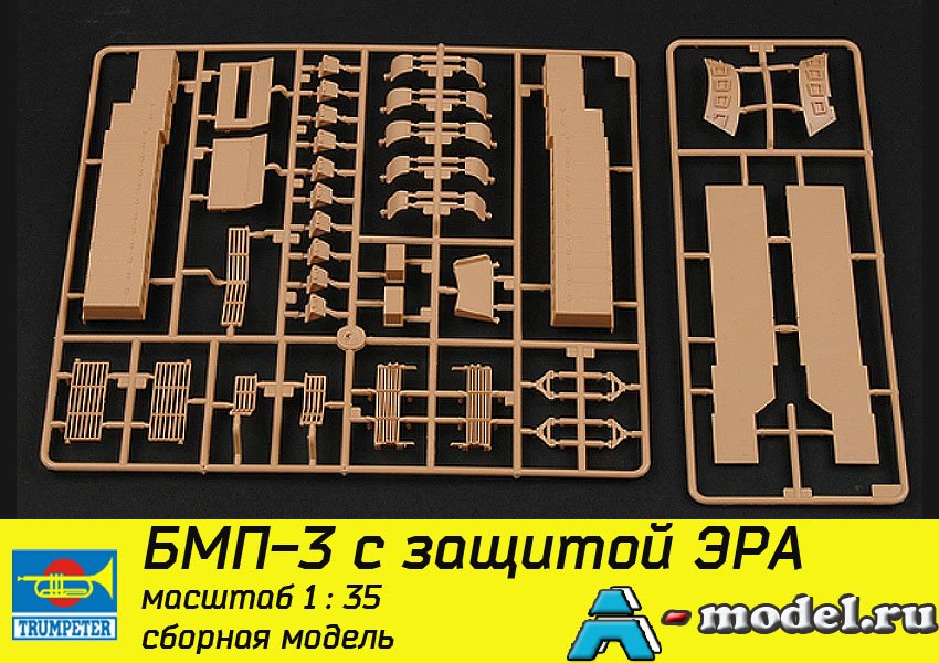 Сборная пластиковая модель БМП-3 с защитой ЭРА в масштабе 1/35 от компании Trumpeter. В комплекте набора с моделью: пластиковые детали, инструкция, декали. фототравление. Отличное схождение деталей модели и прекрасное их качество помогут получить вам удовольствие и массу положительных эмоций во время сборки. Прекрасным дополнением являются декали идущие в комплекте. Понятная инструкция с крупными рисунками облегчит в понимании моментов сборки. Мы давно сотрудничаем с этим производителем, позиция с товаром оригинальна и всегда готова для покупки. У нас всегда в наличии весь ассортимент продукции. В интернет-магазине представлен ассортимент от множества других компаний связанных с моделизмом. Акции и скидки которые часто проводятся у нас позволят вам приобрести товары нашего магазина по привлекательной цене. Вы всегда можете быстро оформить заказ. Предусмотрены несколько видов оплаты банковскими картами. Ваши заказы отправляем в любую точку России после оплаты, при доставке мы выберем минимальный по цене тариф.
