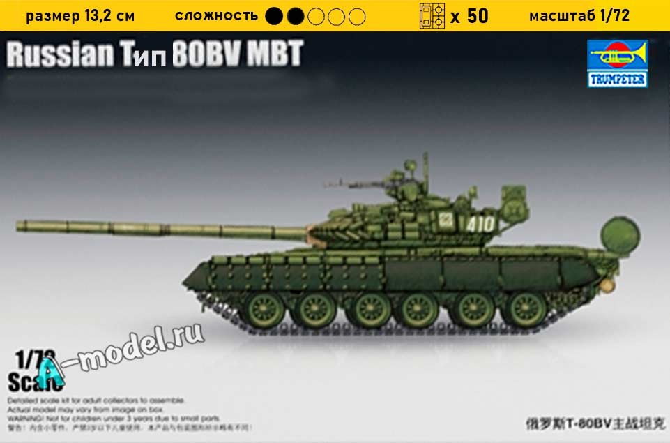 Сборная пластиковая модель танка Т-80 в масштабе 1/72 от компании Trumpeter. В комплекте набора с моделью: пластиковые детали, инструкция, декали. Отличное схождение деталей модели и прекрасное их качество помогут получить вам удовольствие и массу положительных эмоций во время сборки. Прекрасным дополнением являются декали идущие в комплекте. Понятная инструкция с крупными рисунками облегчит в понимании моментов сборки. Мы давно сотрудничаем с этим производителем, позиция с товаром оригинальна и всегда готова для покупки. У нас всегда в наличии весь ассортимент продукции. В интернет-магазине представлен ассортимент от множества других компаний связанных с моделизмом. Акции и скидки которые часто проводятся у нас позволят вам приобрести товары нашего магазина по привлекательной цене. Вы всегда можете быстро оформить заказ. Предусмотрены несколько видов оплаты банковскими картами. Ваши заказы отправляем в любую точку России после оплаты, при доставке мы выберем минимальный по цене тариф.
