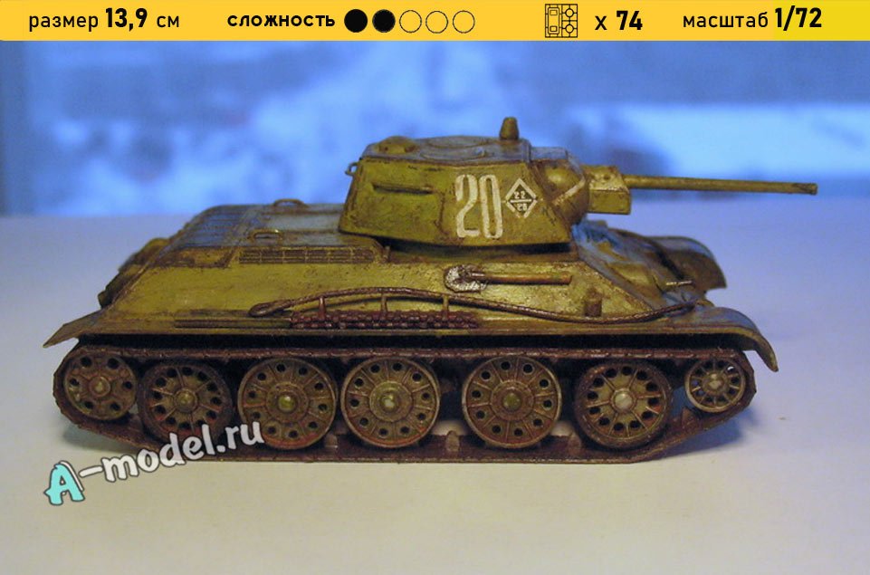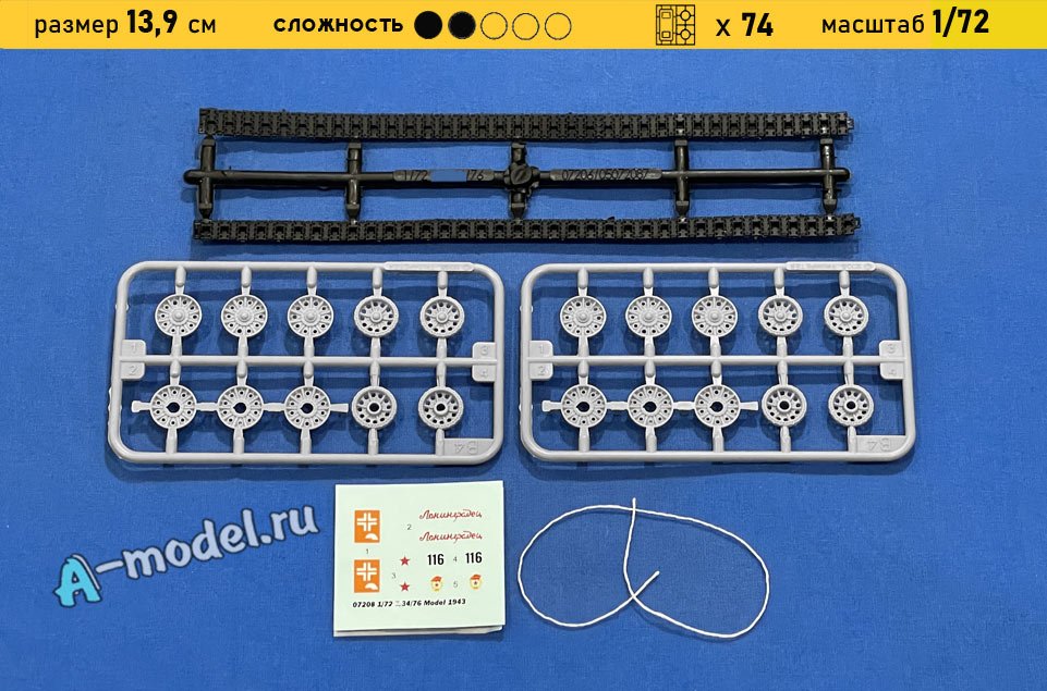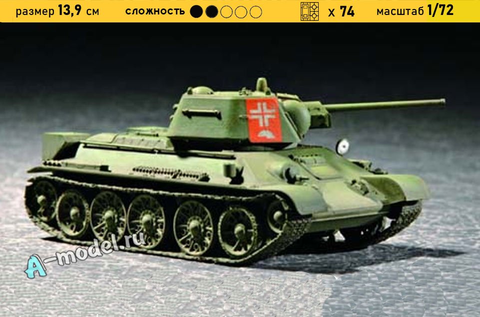 Сборная пластиковая модель танка-34/76 мод 1943 г. в масштабе 1/72 от компании Trumpeter. В комплекте набора с моделью: пластиковые детали, инструкция, декали. Отличное схождение деталей модели и прекрасное их качество помогут получить вам удовольствие и массу положительных эмоций во время сборки. Прекрасным дополнением являются декали идущие в комплекте. Понятная инструкция с крупными рисунками облегчит в понимании моментов сборки. Мы давно сотрудничаем с этим производителем, позиция с товаром оригинальна и всегда готова для покупки. У нас всегда в наличии весь ассортимент продукции. В интернет-магазине представлен ассортимент от множества других компаний связанных с моделизмом. Акции и скидки которые часто проводятся у нас позволят вам приобрести товары нашего магазина по привлекательной цене. Вы всегда можете быстро оформить заказ. Предусмотрены несколько видов оплаты банковскими картами. Ваши заказы отправляем в любую точку России после оплаты, при доставке мы выберем минимальный по цене тариф. Внимание модель не комплектуется клеем и красками, их вы можете отдельно приобрести у нас на сайте.