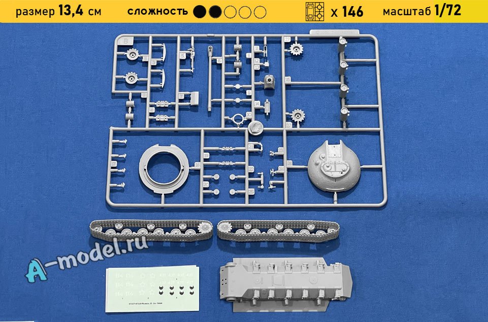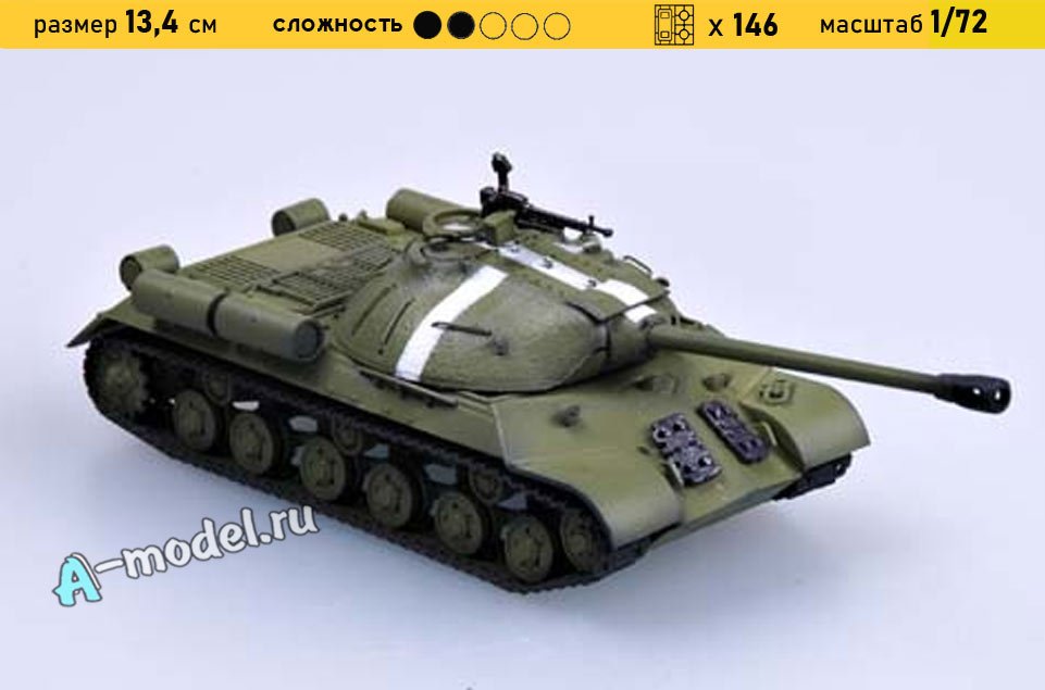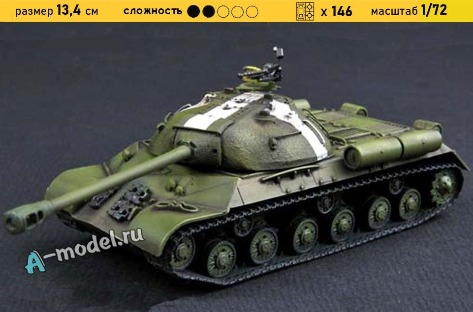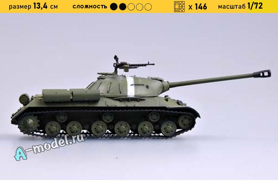 Сборная пластиковая модель танка ИС-3 с пушкой 122-мм в масштабе 1/72 от компании Trumpeter. В комплекте набора с моделью: пластиковые детали, инструкция, декали. Отличное схождение деталей модели и прекрасное их качество помогут получить вам удовольствие и массу положительных эмоций во время сборки. Прекрасным дополнением являются декали идущие в комплекте. Понятная инструкция с крупными рисунками облегчит в понимании моментов сборки. Мы давно сотрудничаем с этим производителем, позиция с товаром оригинальна и всегда готова для покупки. У нас всегда в наличии весь ассортимент продукции. В интернет-магазине представлен ассортимент от множества других компаний связанных с моделизмом. Акции и скидки которые часто проводятся у нас позволят вам приобрести товары нашего магазина по привлекательной цене. Вы всегда можете быстро оформить заказ. Предусмотрены несколько видов оплаты банковскими картами. Ваши заказы отправляем в любую точку России после оплаты, при доставке мы выберем минимальный по цене тариф.