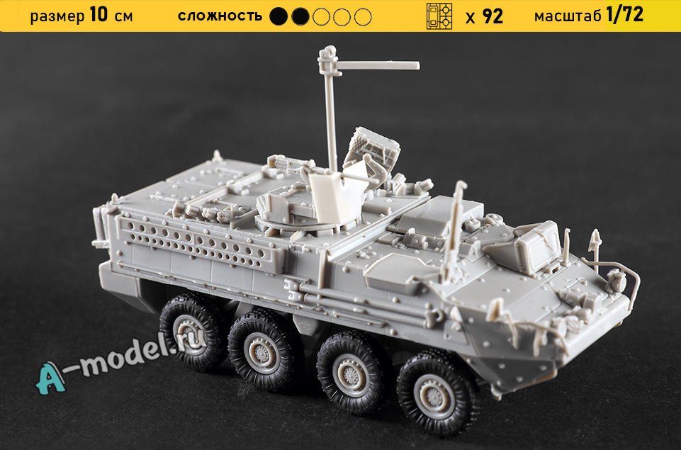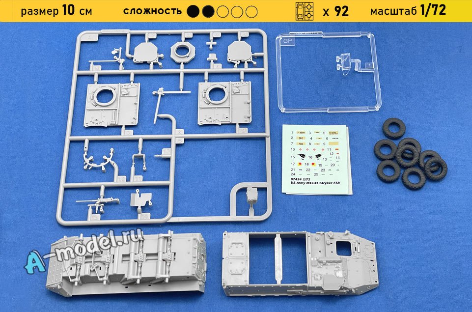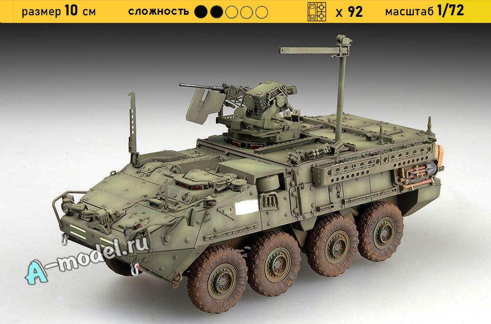 Сборная пластиковая модель M1131 Stryker FSV машина целеуказания и поддержки в масштабе 1/72 от компании Trumpeter. В комплекте набора с моделью: пластиковые детали, инструкция, декали. Отличное схождение деталей модели и прекрасное их качество помогут получить вам удовольствие и массу положительных эмоций во время сборки. Прекрасным дополнением являются декали идущие в комплекте. Понятная инструкция с крупными рисунками облегчит в понимании моментов сборки. Мы давно сотрудничаем с этим производителем, позиция с товаром оригинальна и всегда готова для покупки. У нас всегда в наличии весь ассортимент продукции. В интернет-магазине представлен ассортимент от множества других компаний связанных с моделизмом. Акции и скидки которые часто проводятся у нас позволят вам приобрести товары нашего магазина по привлекательной цене. Вы всегда можете быстро оформить заказ. Предусмотрены несколько видов оплаты банковскими картами. Ваши заказы отправляем в любую точку России после оплаты, при доставке мы выберем минимальный по цене тариф.