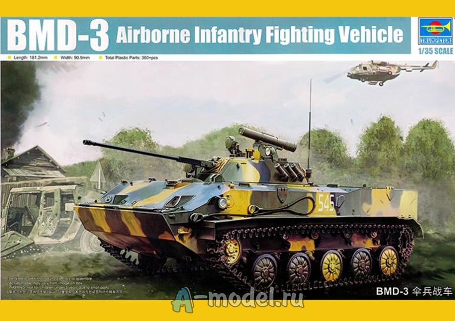 Сборная пластиковая модель БМД-3 в масштабе 1/35 от компании Trumpeter. В комплекте набора с моделью: пластиковые детали, инструкция, декали, фототравление. Отличное схождение деталей модели и прекрасное их качество помогут получить вам удовольствие и массу положительных эмоций во время сборки. Прекрасным дополнением являются декали идущие в комплекте. Понятная инструкция с крупными рисунками облегчит в понимании моментов сборки. Мы давно сотрудничаем с этим производителем, позиция с товаром оригинальна и всегда готова для покупки. У нас всегда в наличии весь ассортимент продукции. В интернет-магазине представлен ассортимент от множества других компаний связанных с моделизмом. Акции и скидки которые часто проводятся у нас позволят вам приобрести товары нашего магазина по привлекательной цене. Вы всегда можете быстро оформить заказ. Предусмотрены несколько видов оплаты банковскими картами. Ваши заказы отправляем в любую точку России после оплаты, при доставке мы выберем минимальный по цене тариф.