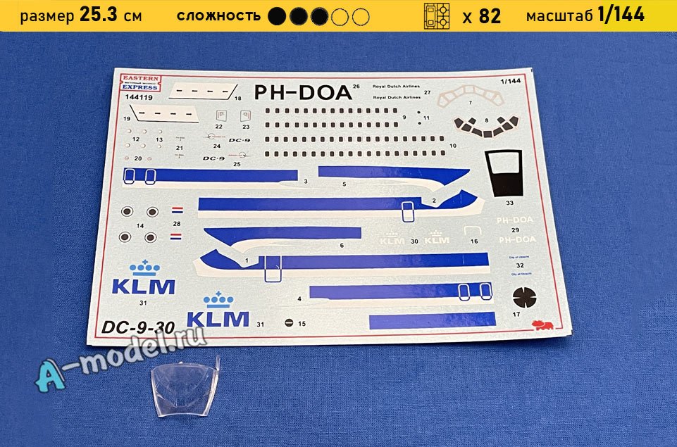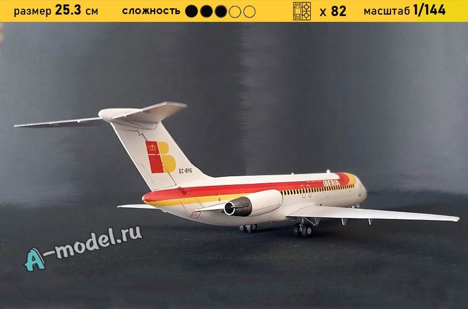 Сборная пластиковая модель пассажирского авиалайнера McDonnell Douglas DC-9-30 в масштабе 1/144 от компании Восточный Экспресс. В комплекте набора с моделью: пластиковые детали, инструкция, декали. Отличное схождение деталей модели и прекрасное их качество помогут получить вам удовольствие и массу положительных эмоций во время сборки. Прекрасным дополнением являются декали идущие в комплекте. Понятная инструкция с крупными рисунками облегчит в понимании моментов сборки. Мы давно сотрудничаем с этим производителем, позиция с товаром оригинальна и всегда готова для покупки. У нас всегда в наличии весь ассортимент продукции. В интернет-магазине представлен ассортимент от множества других компаний связанных с моделизмом. Акции и скидки которые часто проводятся у нас позволят вам приобрести товары нашего магазина по привлекательной цене. Вы всегда можете быстро оформить заказ. Предусмотрены несколько видов оплаты банковскими картами. Ваши заказы отправляем в любую точку России после оплаты, при доставке мы выберем минимальный по цене тариф. Внимание модель не комплектуется клеем и красками, их вы можете отдельно приобрести у нас на сайте.