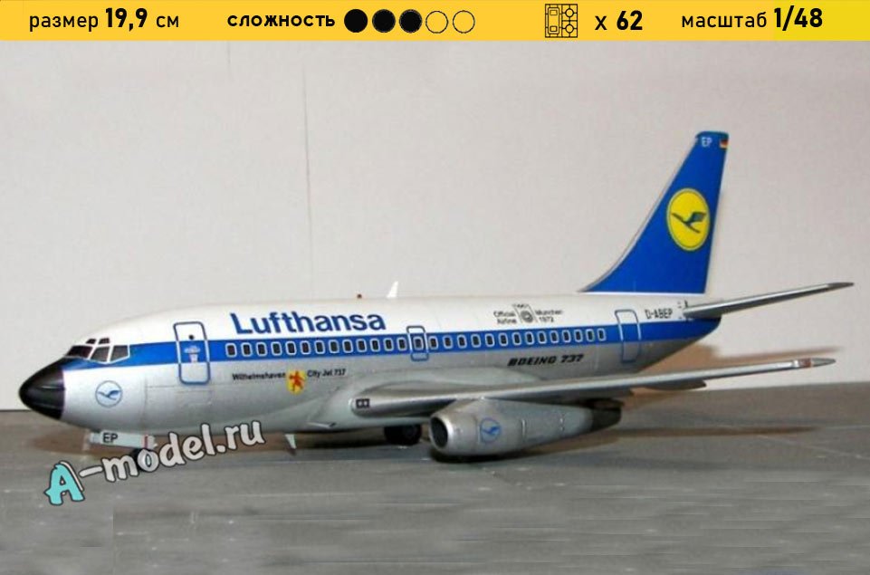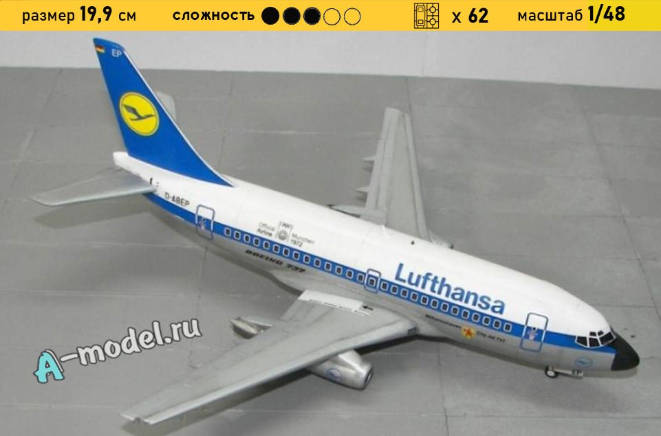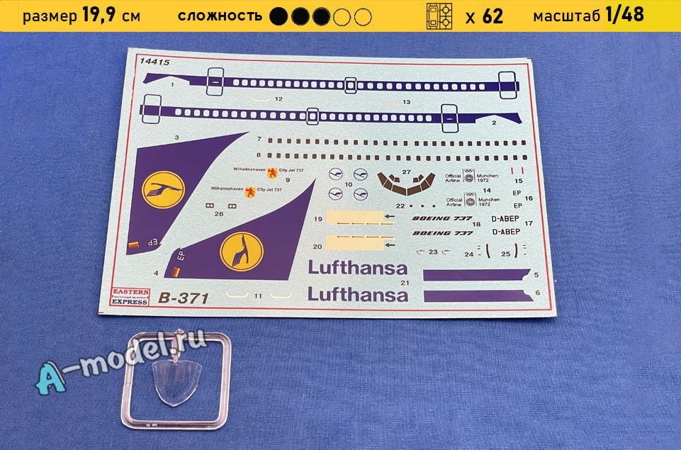 Сборная пластиковая модель Boing B-731 Lufthansa в масштабе 1/144 от компании Восточный Экспресс. В комплекте набора с моделью: пластиковые детали, инструкция, декали. Отличное схождение деталей модели и прекрасное их качество помогут получить вам удовольствие и массу положительных эмоций во время сборки. Прекрасным дополнением являются декали идущие в комплекте. Понятная инструкция с крупными рисунками облегчит в понимании моментов сборки. Мы давно сотрудничаем с этим производителем, позиция с товаром оригинальна и всегда готова для покупки. У нас всегда в наличии весь ассортимент продукции. В интернет-магазине представлен ассортимент от множества других компаний связанных с моделизмом. Акции и скидки которые часто проводятся у нас позволят вам приобрести товары нашего магазина по привлекательной цене. Вы всегда можете быстро оформить заказ. Предусмотрены несколько видов оплаты банковскими картами. Ваши заказы отправляем в любую точку России после оплаты, при доставке мы выберем минимальный по цене тариф. Внимание модель не комплектуется клеем и красками, их вы можете отдельно приобрести у нас на сайте.