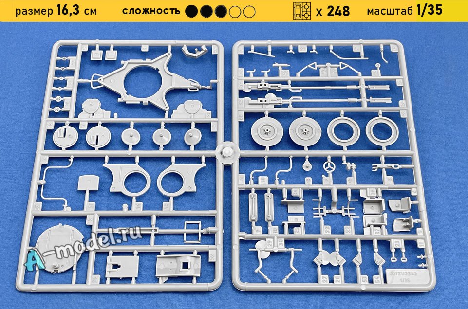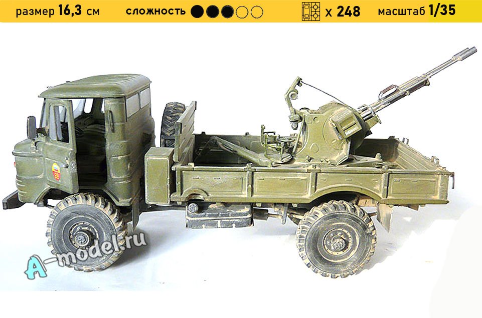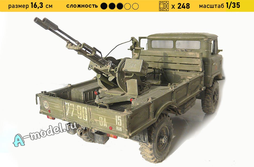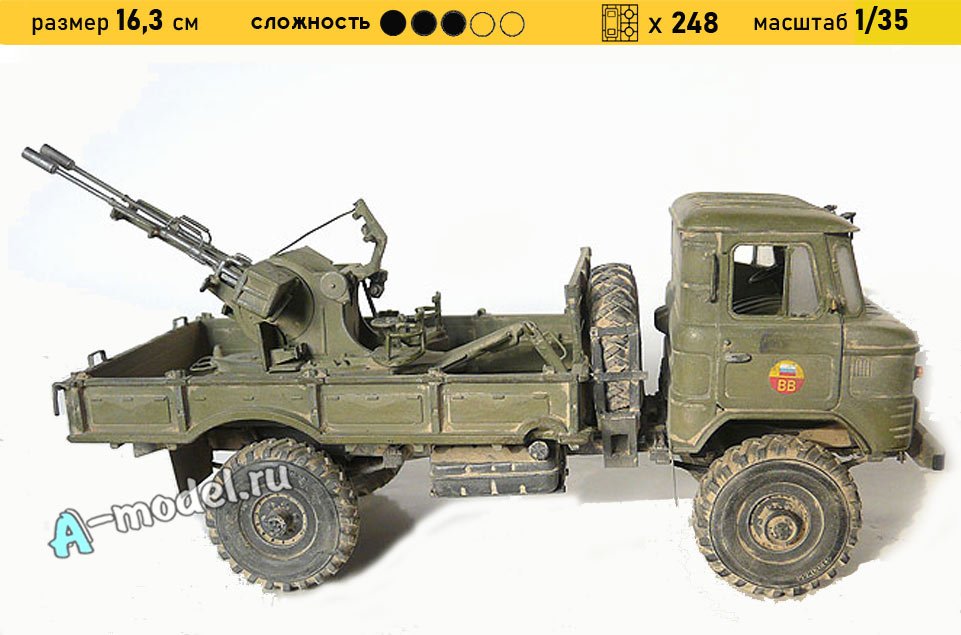 Сборная пластиковая модель грузового автомобиля ГАЗ-66 с ЗСУ-23-2 в масштабе 1/35 от компании Восточный Экспресс. В комплекте набора с моделью: пластиковые детали, инструкция, декали, резиновые шины. Отличное схождение деталей модели и прекрасное их качество помогут получить вам удовольствие и массу положительных эмоций во время сборки. Прекрасным дополнением являются декали идущие в комплекте. Понятная инструкция с крупными рисунками облегчит в понимании моментов сборки. Мы давно сотрудничаем с этим производителем, позиция с товаром оригинальна и всегда готова для покупки. У нас всегда в наличии весь ассортимент продукции. В интернет-магазине представлен ассортимент от множества других компаний связанных с моделизмом. Акции и скидки которые часто проводятся у нас позволят вам приобрести товары нашего магазина по привлекательной цене. Вы всегда можете быстро оформить заказ. Предусмотрены несколько видов оплаты банковскими картами. Ваши заказы отправляем в любую точку России после оплаты, при доставке мы выберем минимальный по цене тариф.
