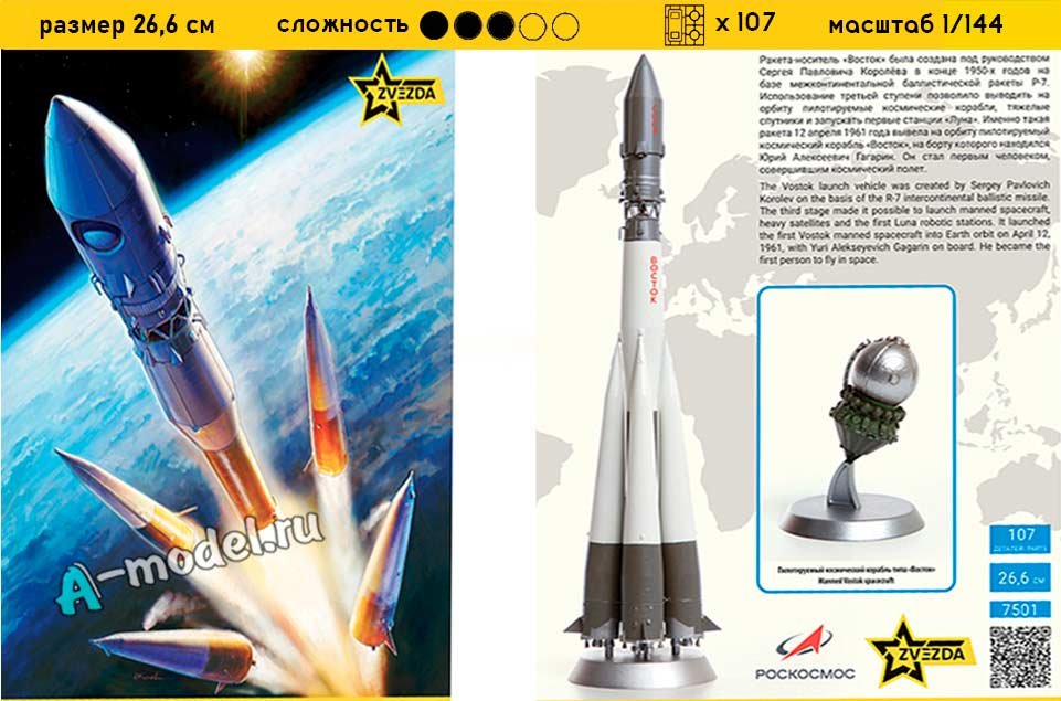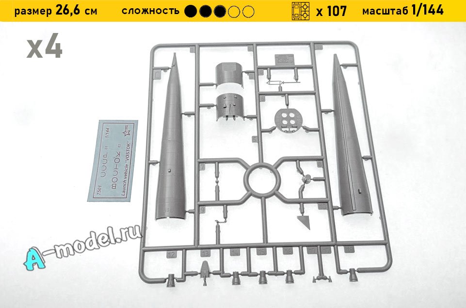 Сборная пластиковая модель в масштабе 1/144 от компании Звезда ракета-носитель «Восток» с космическим кораблем "Восток 1". В комплекте набора с моделью: пластиковые детали, инструкция, декали. Отличное схождение деталей модели и прекрасное их качество помогут получить вам удовольствие и массу положительных эмоций во время сборки. Прекрасным дополнением являются декали идущие в комплекте. Понятная инструкция с крупными рисунками облегчит в понимании моментов сборки. Мы давно сотрудничаем с этим производителем, позиция с товаром оригинальна и всегда готова для покупки. У нас всегда в наличии весь ассортимент продукции. В интернет-магазине представлен ассортимент от множества других компаний связанных с моделизмом. Акции и скидки которые часто проводятся у нас позволят вам приобрести товары нашего магазина по привлекательной цене. Вы всегда можете быстро оформить заказ. Предусмотрены несколько видов оплаты банковскими картами. Ваши заказы отправляем в любую точку России после оплаты, при доставке мы выберем минимальный по цене
